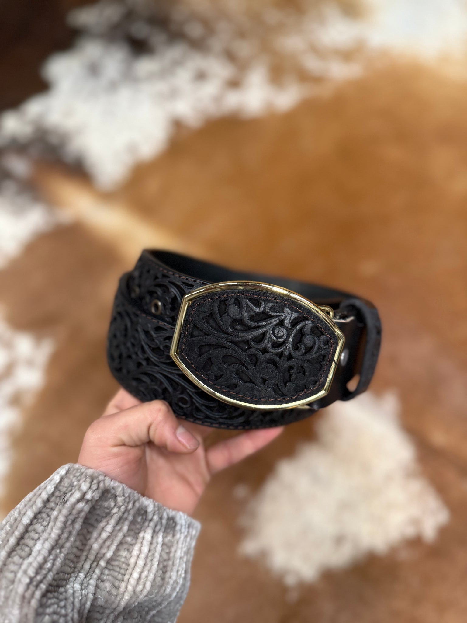 cinto en color negro con debía dorada, con detalle recortado a láser